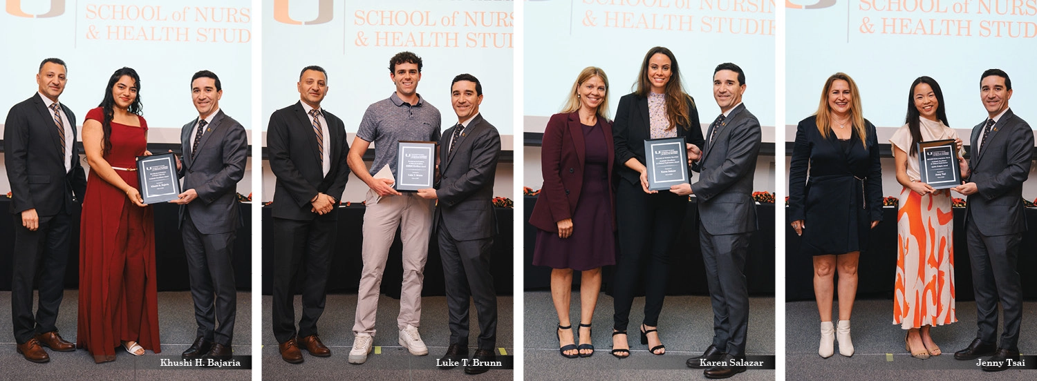 Pinning soon-to-be graduates with Dean Santos were associate deans Dr. Arsham Alamian (Health Studies), Dr. Willy Prado (Research Affairs), Dr. Maria Ortega Hernandez (Graduate Clinical Nursing), and Dr. Nichole Crenshaw (Undergraduate Nursing).