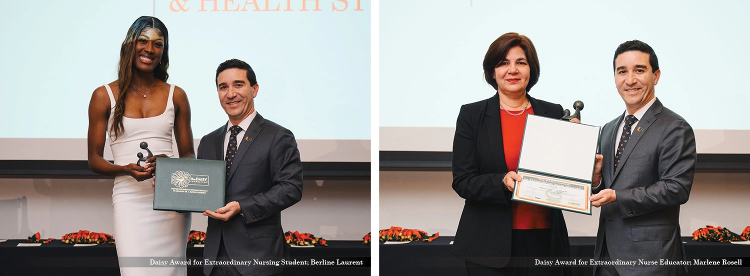 The evening’s final individual awards were presented by Dean Santos. Marlene Rosell, an adjunct clinical nurse faculty member, wiped tears away as she walked offstage with her DAISY Award for Extraordinary Nurse Educator. Her students, who selected her for the honor, erupted in cheers when her name was called. And, for the second time of the night, accelerated B.S.N. graduate Berline Laurent, B.S.N. ’25, was called to the stage, this time to receive the DAISY Award for Extraordinary Nursing Student. Known worldwide, DAISY Awards, noted Dean Santos, “are extremely significant,” recognizing the “highest levels of compassion, service, and professionalism in nursing.”