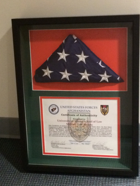 To show their appreciation, the U.S. Military flew a flag over U.S. headquarters in Afghanistan in honor of Miami Law’s Military Law Society, and later shipped the flag to the law school along with a certificate of authenticity.