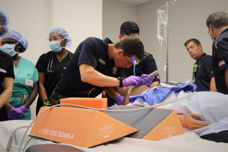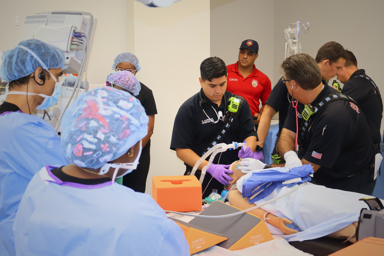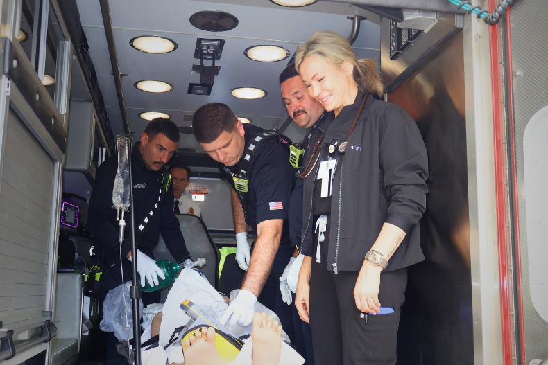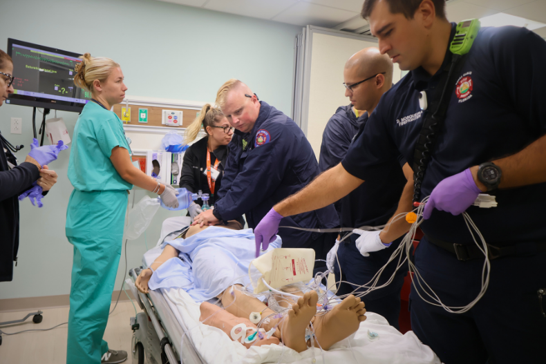 The training exercises took place at S.H.A.R.E. Simulation Hospital Advancing Research & Education®, where educators created a three-part scenario simulating real-life trauma challenges, including complications from elective surgeries. The simulation began with a prebriefing, followed by a scenario where a young woman experienced complications from a cosmetic procedure. Nursing students role-played as the surgical team, and a real CGFD crew responded to the emergency, transporting the patient to a simulated Level 1 trauma center, where another group of nursing students responded to the trauma in concert with CGFD’s team.