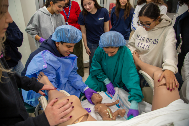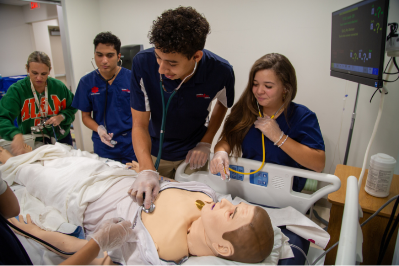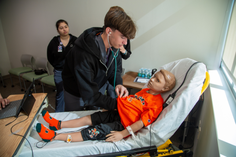 One of the day’s most popular activities was Giving Birth with Victoria, where instructors taught students on a high-fidelity manikin in simulated labor how to assess an expectant mother’s vital signs and use a tocodynamometer (TOCO) device to measure frequency, duration, and intensity of uterine contractions. Instructors reinforced the importance of compassionate care by having students practice therapeutic communication with Victoria during the delivery. The students also got the chance to take vitals and assess lung, heart, and bowel sounds on two other high-tech manikins—Super TORY, a newborn, and Pediatric HAL. Seniors Gabriel Ruiz and Alexis Arias, both from Southwest Miami High, said the experience encouraged them to think more about pediatrics as a possible specialty.