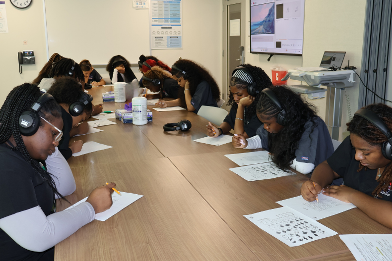 Empathy was a key theme of the “Hearing Voices” exercise led by Dr. Frank Guido-Sanz, associate dean for simulation education and research at the School of Nursing and Health Studies. In it, participants were asked to complete cognitive tasks while wearing noise-cancelling headphones to simulate the lived experiences of a patient with schizophrenia. Participants received a summary of health conditions which present auditory hallucinations, how they may affect cognition, and other pertinent information. After the exercise, Dr. Guido-Sanz led a debriefing using the PEARLS framework, exploring students’ reactions, feelings, experiences, and analyses of the simulation. The debriefing framework used with all simulation activities at S.H.A.R.E. gave the students a clear understanding of the analytical, reflective approach they will be expected to use in college.