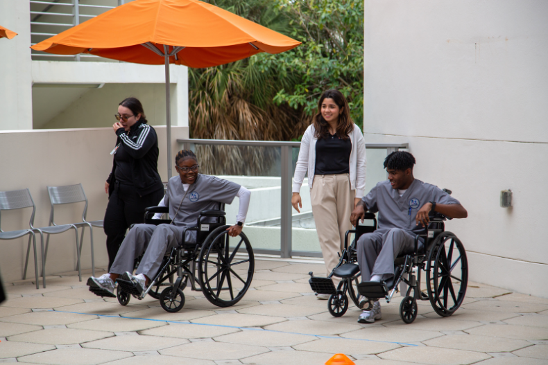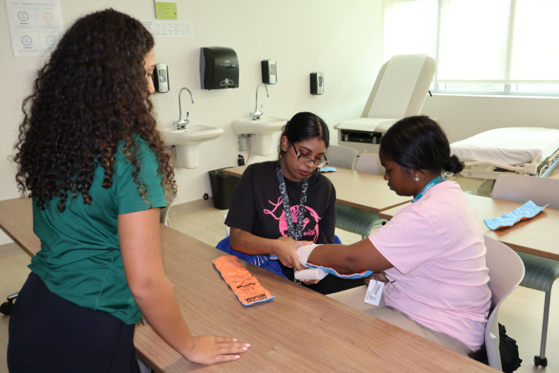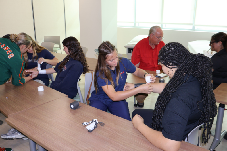 Those doors opened quite literally on December 11, 2025, welcoming students from Ronald Reagan Doral, Southwest Miami, Cypress Bay, Miramar, Immaculata-La Salle, Dibia DREAM, and Colonial Christian high schools to the Coral Gables campus. From S.H.A.R.E.’s first floor to its fifth, participants rotated through interactive stations. Taylor Wilmoth, a lecturer and clinical coordinator for the Athletic Training Program at the School of Education and Human Development, was impressed by how quickly the students caught on to lessons about taping and wrapping minor injury, splinting for more advanced recovery support, and basic cervical spine aid. “Watching them develop from not being able to tear tape to securing a wrist in 17 minutes’ time showed just how invested they were,” said Wilmoth, who was new to the event. “Their excitement was reflected in the skills they gained throughout the day.”