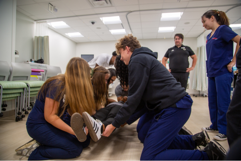 Participants jumped into action when SimMan’s health suddenly deteriorated. The high schoolers had been practicing vital signs on SimMan and other specialized training manikins at S.H.A.R.E. Simulation Hospital Advancing Nursing & Education® (S.H.A.R.E.) when simulation technologists activated signs of a seizure from behind the scenes. Guided by trained instructors, the South Florida teens soon learned how to safely place SimMan on oxygen and roll him onto his side to prevent further injury during the crisis. This event taught the students lifesaving techniques and helped strengthen their awareness of how important team-based communication and critical‑thinking are in health care settings.